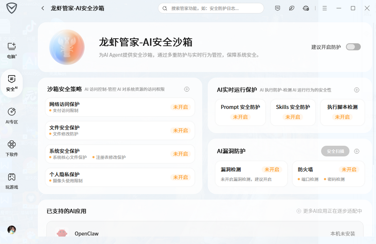 AI安全沙箱:精准封堵AI Agent隐患,一键开启系统/文件/Skills/Prompt等多重防护。